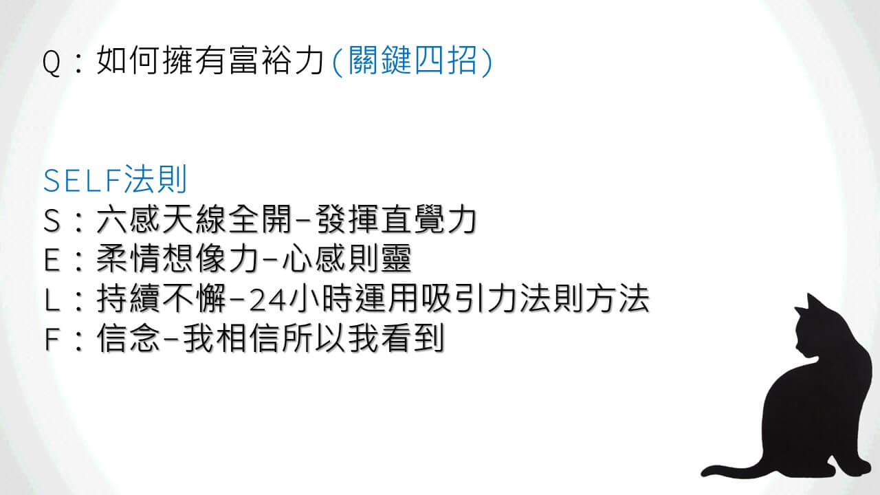 2. 追求富裕力的方法SELF,這方法最重要的是心感則靈。