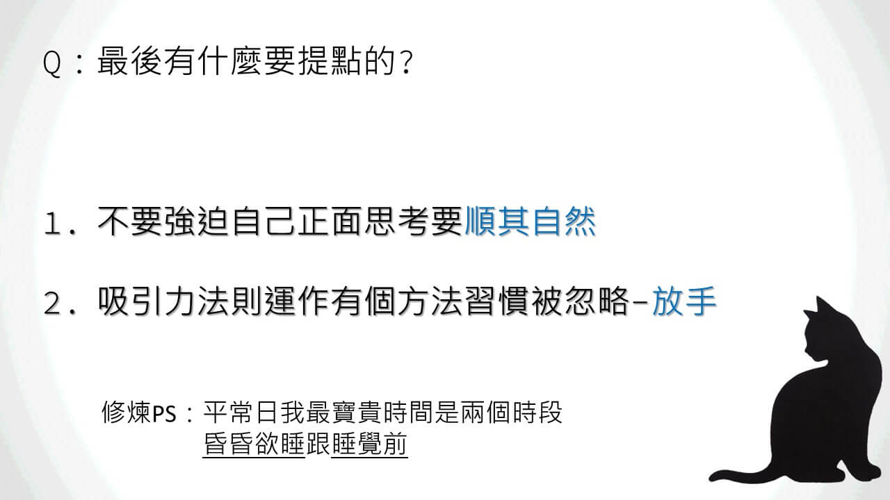 吸引力法則運用時常有個誤解,要積極樂觀事實是不要強迫自己積極樂觀,不要強迫自己正面思考要順其自然,面對生活上困境時不要強迫自己樂觀,這強迫會讓潛意識發出匱乏訊息,很多機會存在平常不想去做不敢去做裡面,例如不習慣跑步讓自己去跑一條比較長的路,慢慢心情會變得比較好在這情況下開始想像自己想要的畫面,就算過程中看到的跟你想要的都相反但沒關係,相信你想要的畫面會出現,想像過程中覺得心煩氣躁就把這些想像放掉。