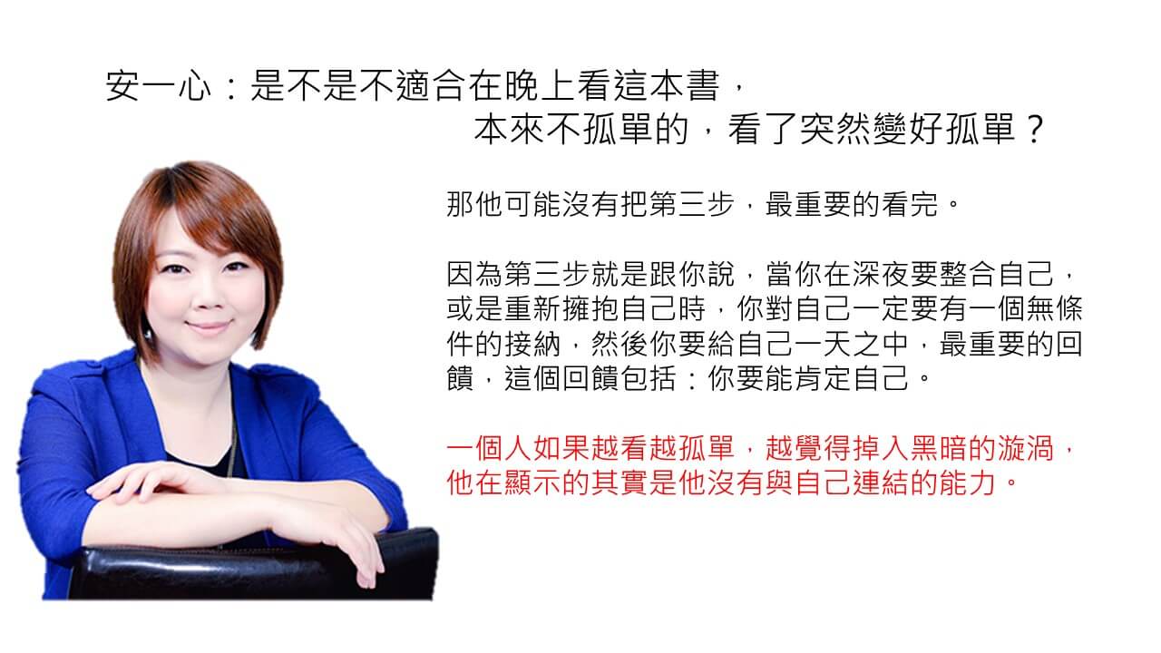 安:我覺得老師這本「入夜擁抱你」,剛開始就要好好的去面對真實的自己,讓自己可以好好療癒自己的心,把自己先好好圓滿,才能讓外在的投射更加美滿。