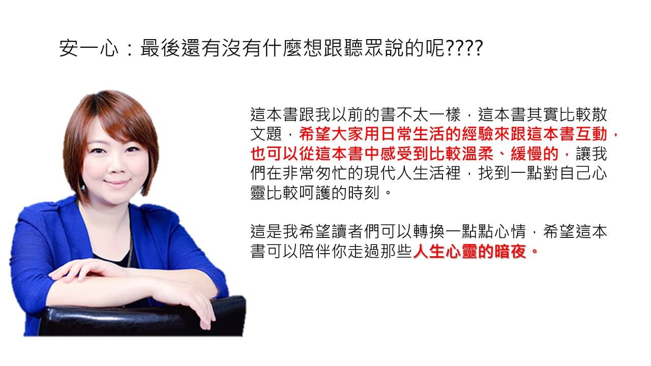 安:很多人看了書後,會知道自己有這些狀況,可是實際上遇到感情上的狀況時,還是會一直鬼打牆,他把我不愛他的那些缺點都顯現出來,我的害怕、孤單…
