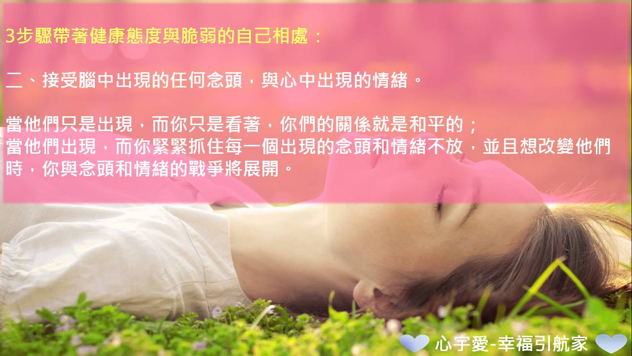 二、接受腦中出現的任何念頭,與心中出現的情緒:幫助你調整內在處於一個平靜、舒服的狀態。
