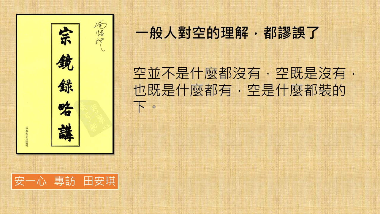 主持人: 親愛的朋友,又在空中跟大家見面,今天很特別邀請到安琪,來跟我們分享上一集跟大家介紹的宗鏡錄略講,可以把古書,這麼白話的談出來,就安琪最適合。