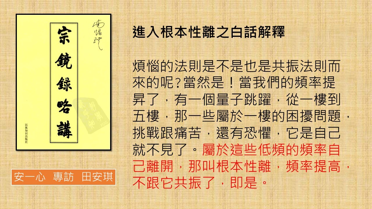 煩惱的法則是不是也是共振法則而來的呢?當然是!當我們的頻率提昇了,有一個量子跳躍,從一樓到五樓,那一些屬於一樓的困擾問題,挑戰跟痛苦,還有恐懼,它是自己就不見了。我們五樓看不到一樓的情況。至於五樓的境界,五樓看不到一樓,一樓自己離開,屬於這些低頻的頻率自己離開,那叫根本性離,用這個方法,來逐漸進入大自由、大自在的狀態,就是空的狀態,不斷的做基本功而已,那一些煩惱,你不用主動出手解決,它自己就會掉落, 頻率提高,不跟它共振了,這叫根本性離。