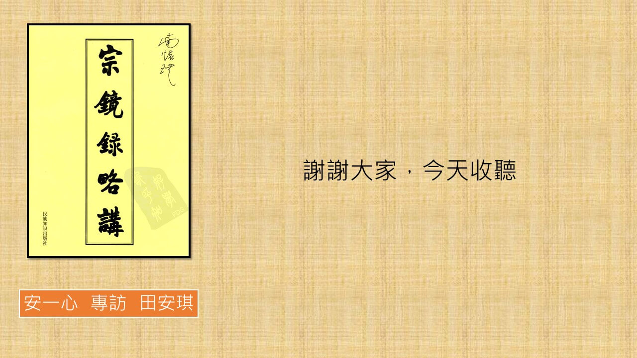 主持人: 謝謝安琪跟我們分享宗鏡錄略講,還有很多,很精采,有機會的話,再請安琪多多來講,謝謝,拜拜!