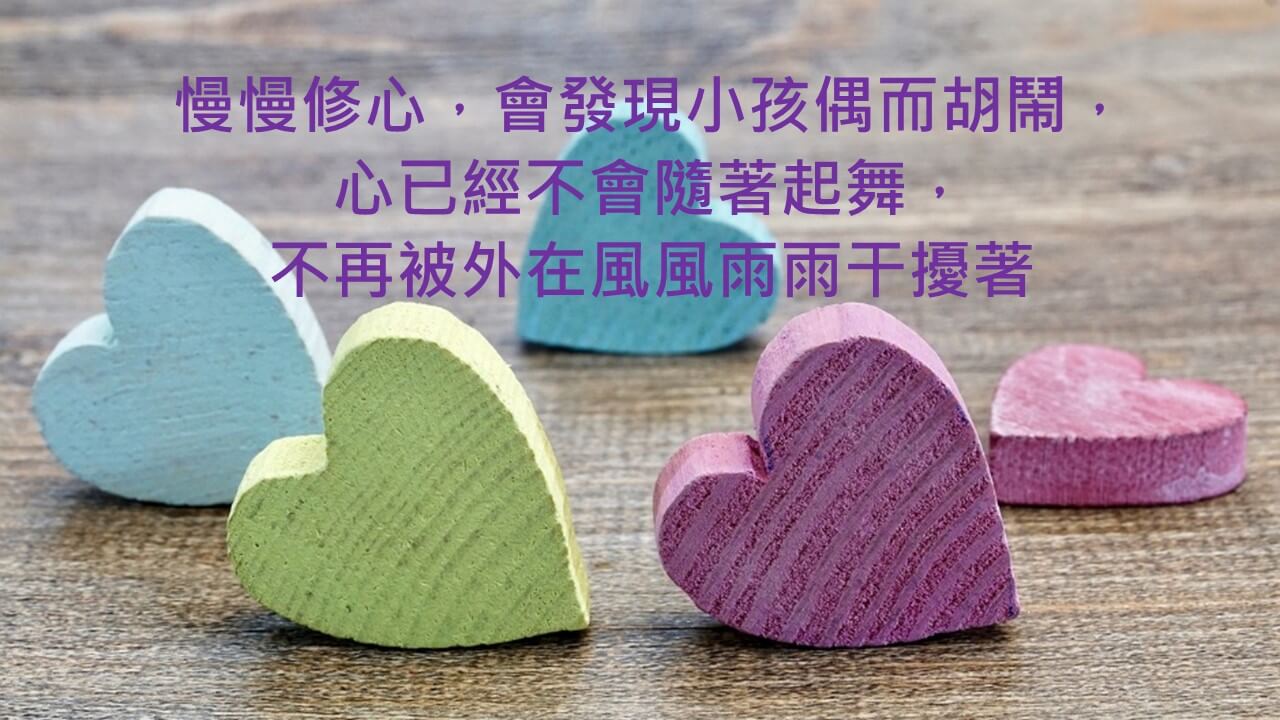 慢慢修心,就會發現,小孩偶而在那胡鬧,心已經不會隨著起舞,不再被外在的風風雨雨給干擾了。