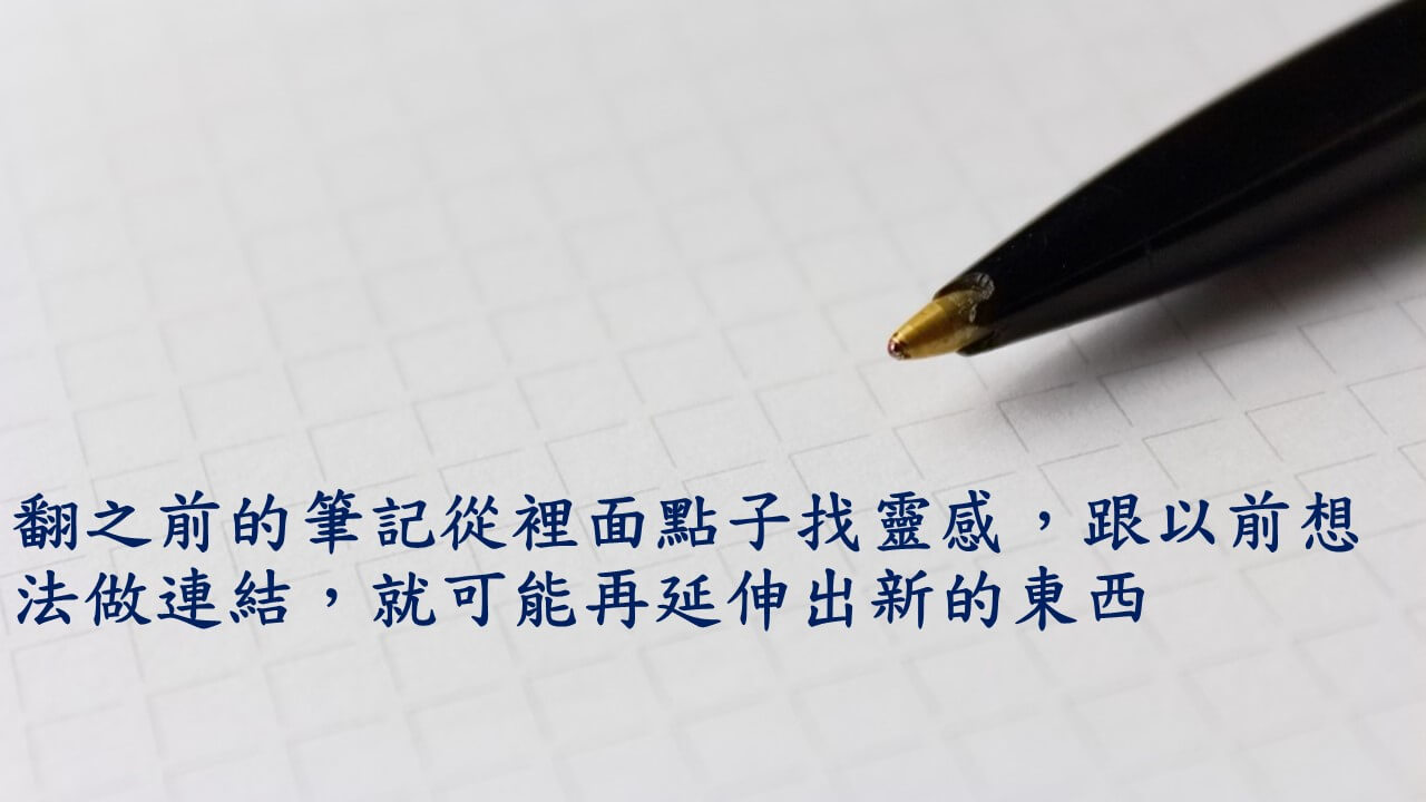 並不是說只要這樣子就好,偶而還是要回去翻自己的筆記,當他遇到困境的時候,或是他想的方法,別人已經發明了,就會回去翻他這些從以前寫到現在,裡面的點子找靈感,跟以前的想法去做一個連結,那可能就會再延伸出新的東西。