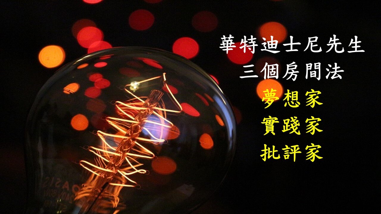 剛剛有說到,華特迪士尼先生,他有用三個房間法,據說他在發想迪士尼動畫的時候,辦公室裏面有三個房間,這三個房間有不同的顏色,分別代表夢想家、實踐家跟批評家。