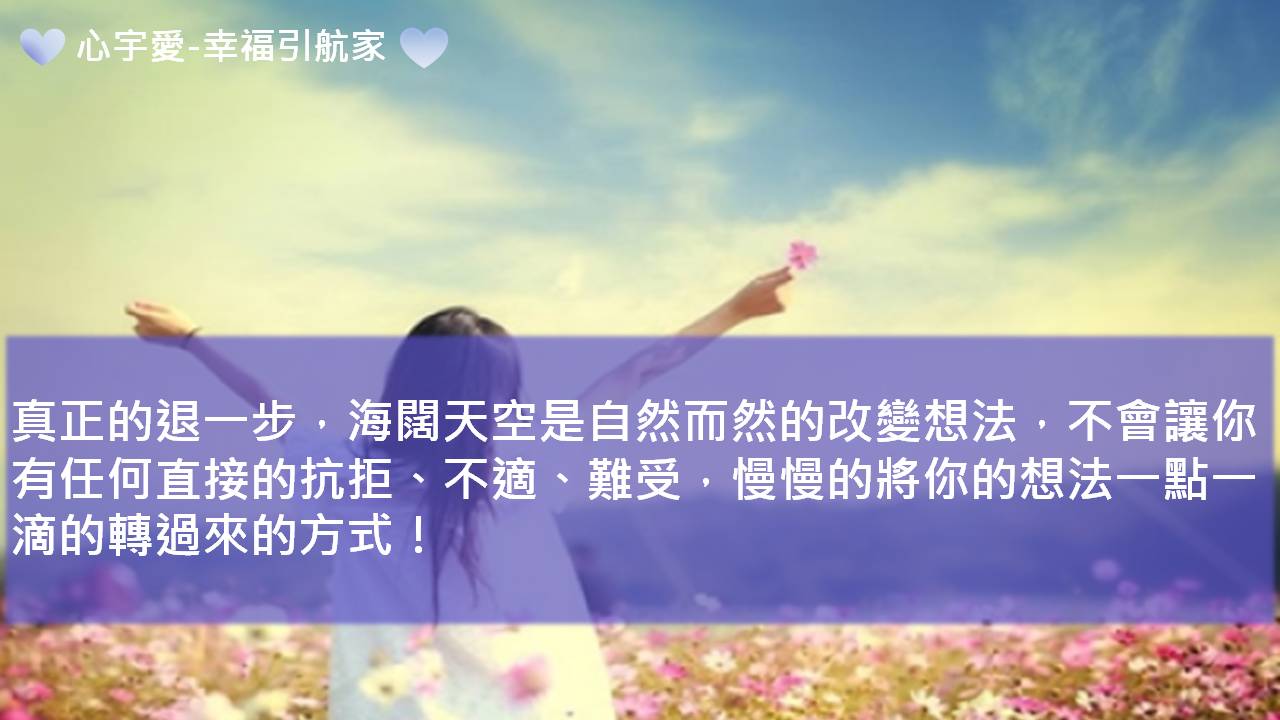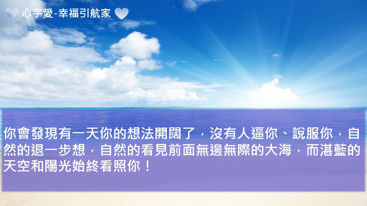 你會發現有一天你的想法開闊了,沒有人逼你、說服你,你自然的退一步想,自然的看見你前面無邊無際的大海,而湛藍的天空和陽光始終看照你!