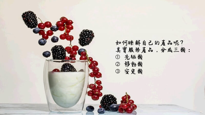 有提到一個部份,一件事情你要先去思考自己現在的狀態,公司可能提供很多的服務,那哪一些服務是比較創新的,哪一些服務是既有,然後有一些微調的,服務一些比較基礎的、制式的東西。