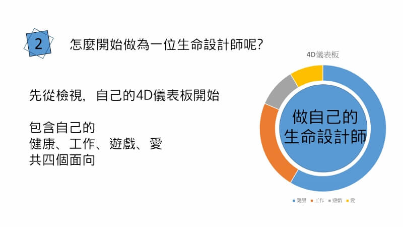 你要做一個儀表板,就像我們要出發之前,要先秤秤自己的斤兩,了解自己現在所在的位置在哪裡,他就會有一個叫做4D的儀表板,分別是健康、工作、遊戲和愛。