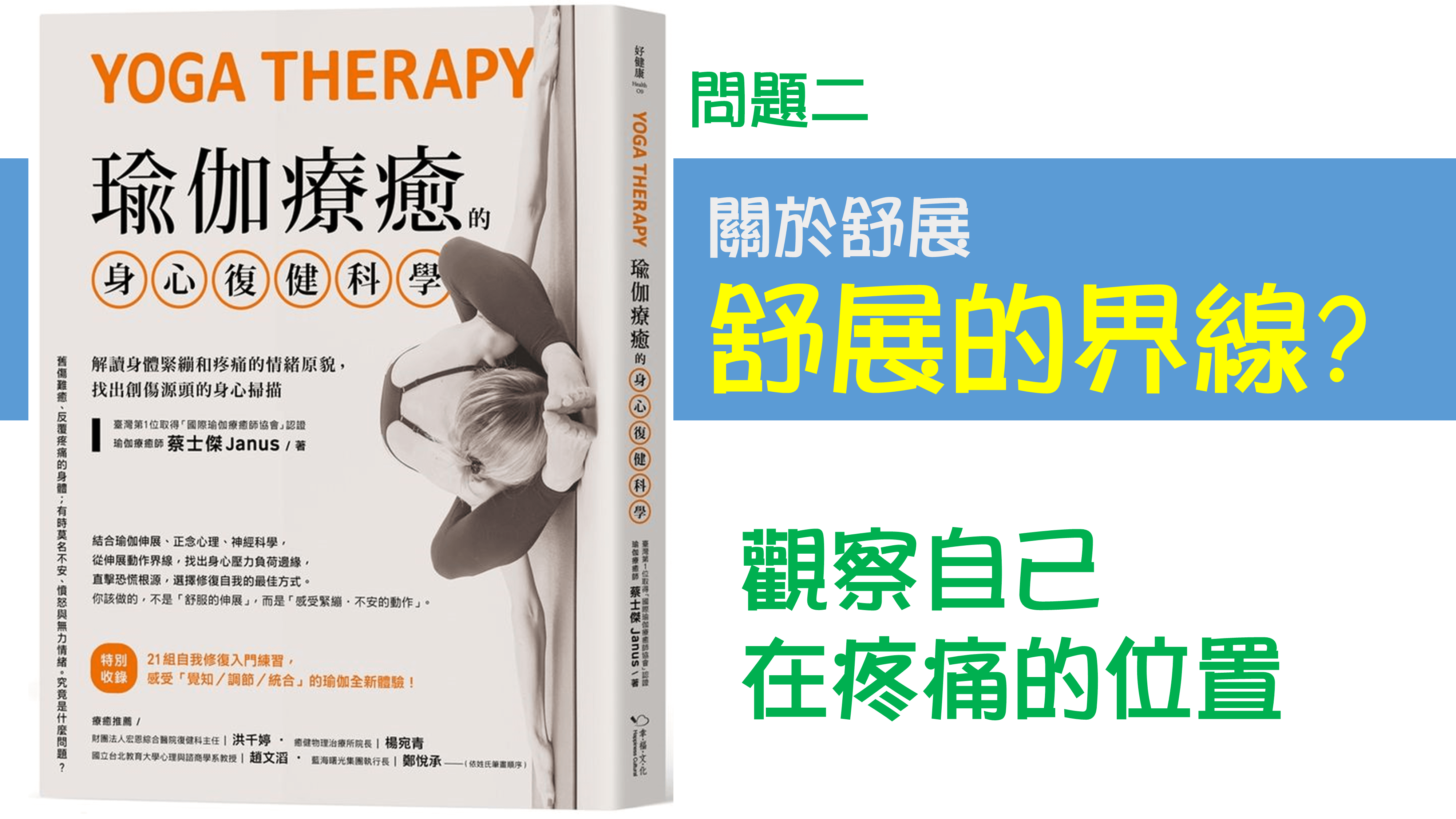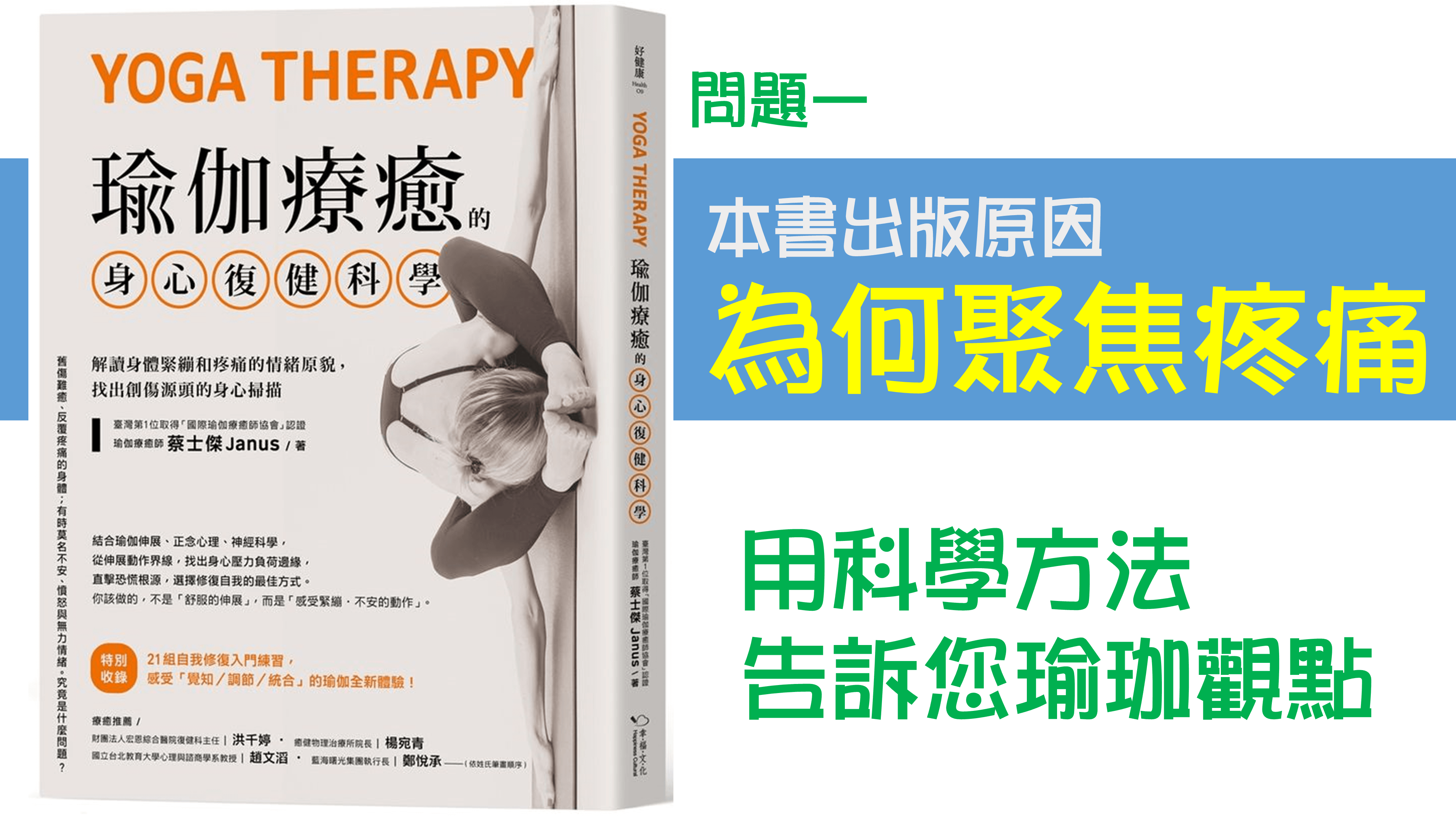 當時想要出這本書是因為在台灣關於瑜伽療癒算是比較新興的科學,並沒有那麼普及,因為我本身的興趣,在前幾年陸續到加拿大跟日本學習關於瑜伽療癒的這個部分,也學習到了從瑜伽來幫助慢性疼痛的照護。
