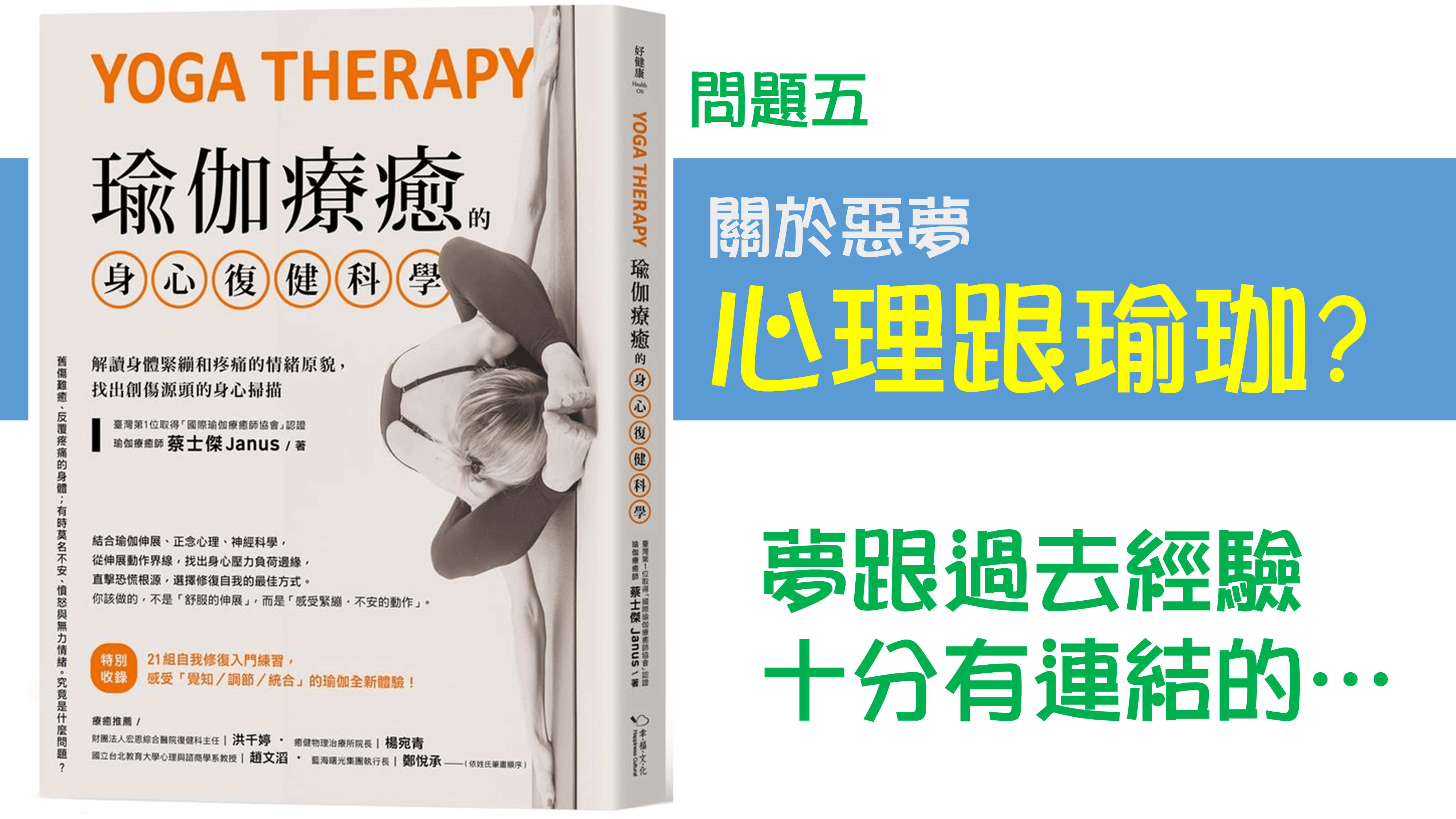 書中有提到了一些案例關於如果是過去經驗的話,我們會利用這個瑜伽療癒的方法,在過程中也幫助探索過去的經驗,對他所造成的影響,甚至幫助他可不可以去處理過去的不好的經驗,讓這個狀況慢慢的改善。