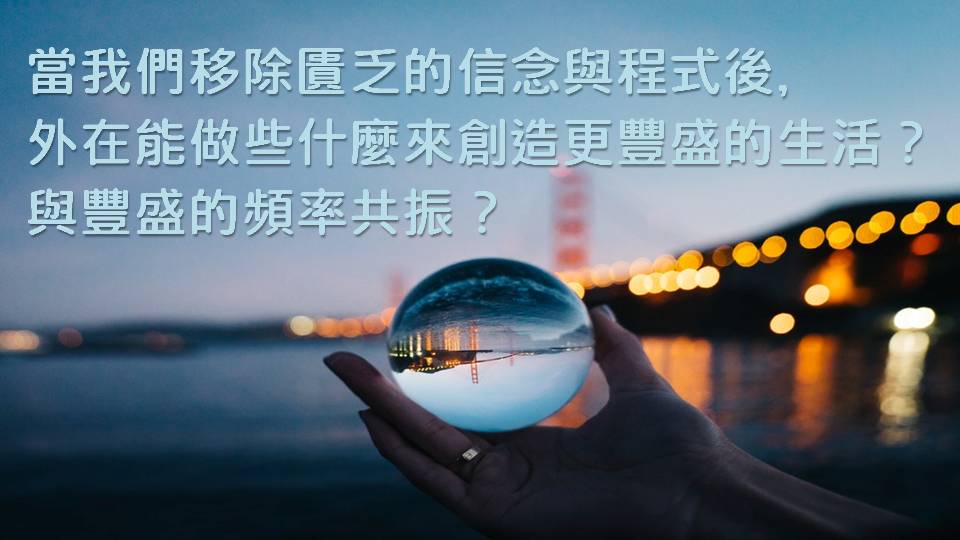 你的能量場裡面,豐盛已經在那邊等你了,只是因為你的阻礙沒有辦法取到那些豐盛,可是你把四周圍的阻礙:祖先、前世、靈魂的負面信念…清除時,豐盛是非常容易進來的,而且每個人與生俱來都是可以值得擁有豐盛的。