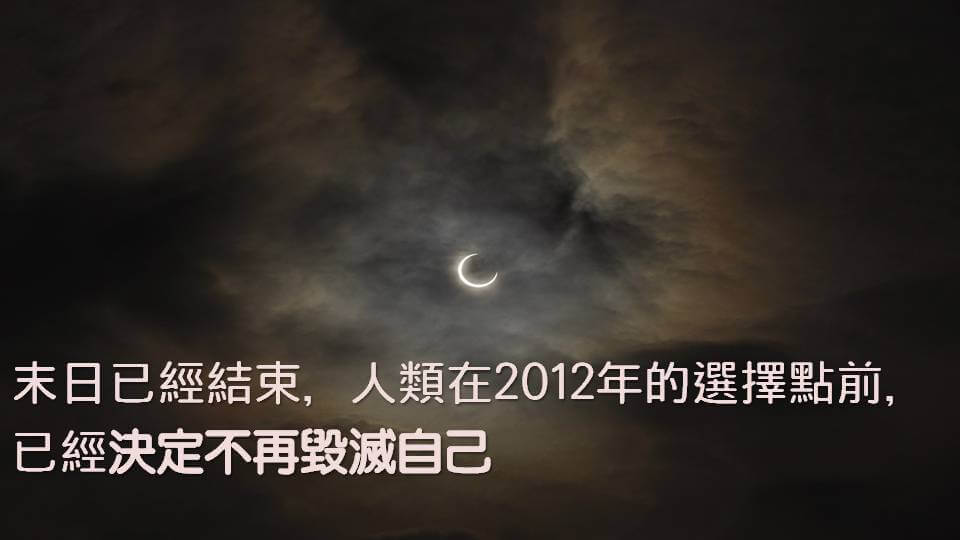 所以我們說克里昂資料的另外一個重點,末日已經沒有了,因為我們通過了2012年的分歧點,本來以前的那些預言家或是任何方面的預言,通常都會指著說,好像2012年或2012年前後這個末日的來臨,但這只是一個選擇點。