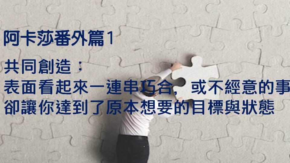 所謂的共同創造,意思就是表面上看起來好像會一連串巧合,或一連串不經意的,但是巧合的事情,讓你達到了原本想要,但是又覺得做不到的事情。