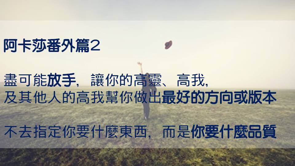 比如像是,我希望找到一個能夠好好發展的工作,那是一個概括性的說明,那是一個方向,那麼你的高我,還有其他人的高我,就會去努力的把最適合你的,最好的版本交在你手上。