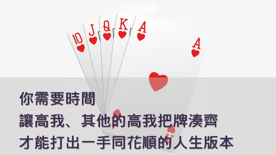 也就是說在這個方面要有耐心,是因為一定會有最好的版本出現,可是你真的需要時間,讓你的高我、其他的高我去把牌湊齊,才能打出一手同花順