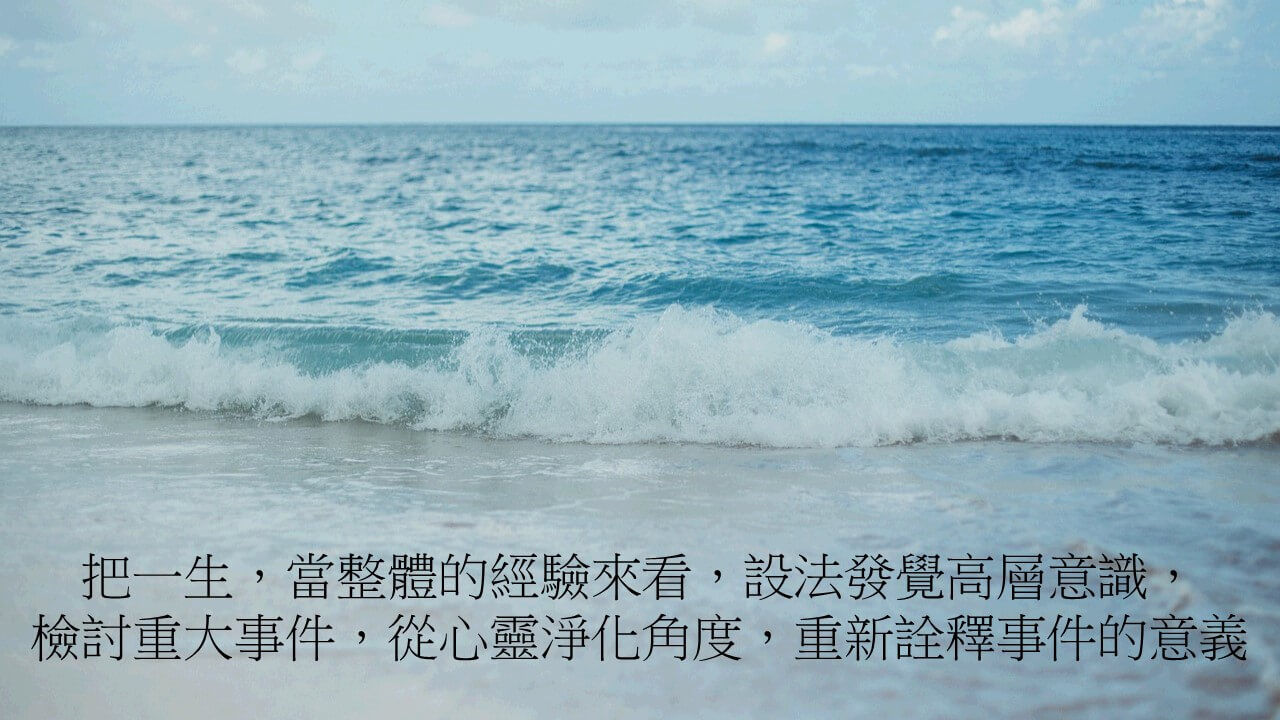 5.把一生,當整體的經驗來看,設法發覺高層意識,檢討重大事件,從心靈淨化角度,重新詮釋事件的意義