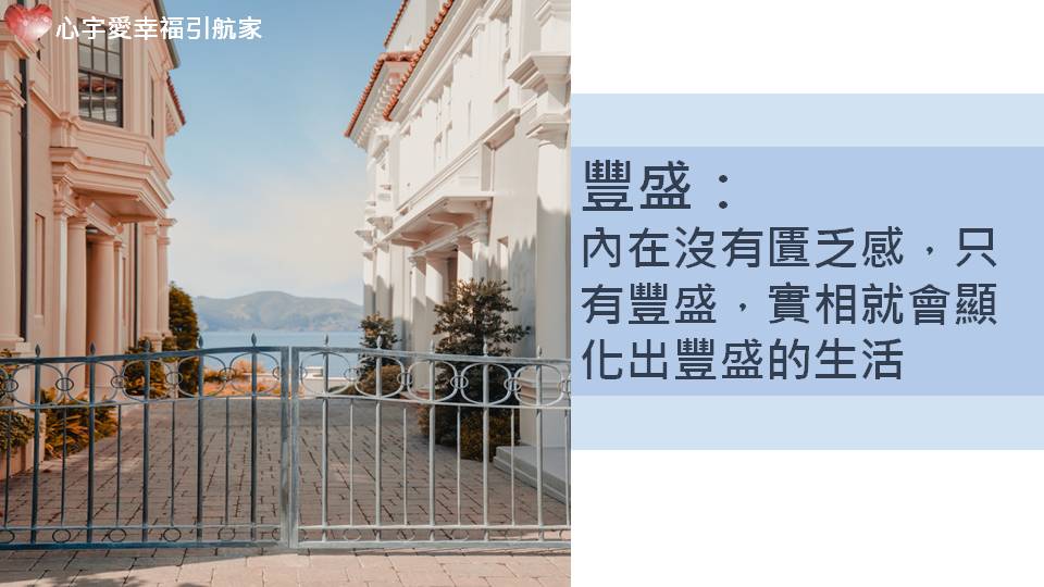就是內在沒有匱乏感,只有豐盛的感覺,那麼實相也會為你顯化出豐盛的生活給你。