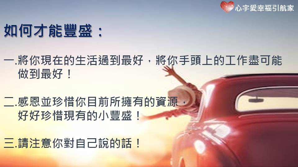 然後調整你自己的狀態,讓自己再多做一些小行動、小努力,讓小豐盛變大豐盛!
