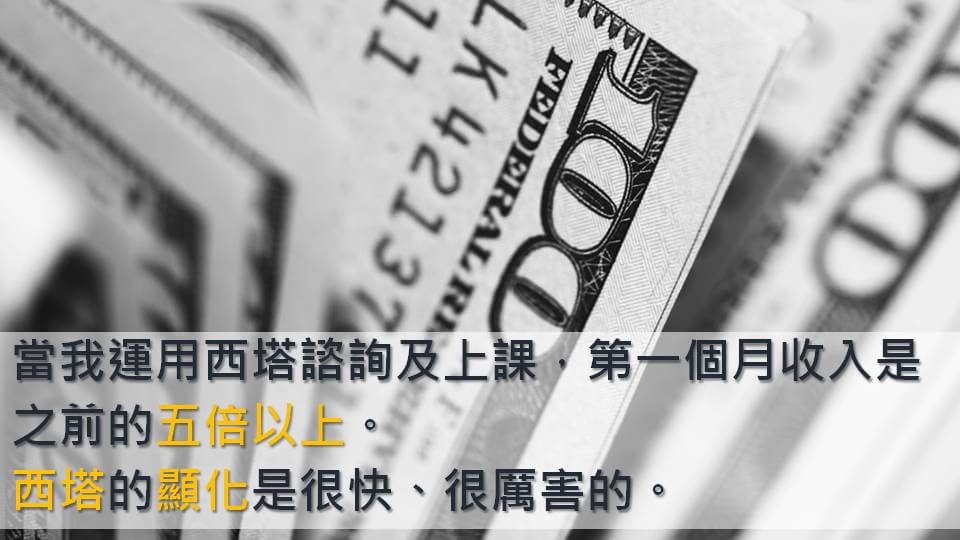 以財富來說,我也跟我的學員們說,當我開始運用希塔來諮詢及上課時,第一個月我就發現我的收入是我之前的五倍以上。