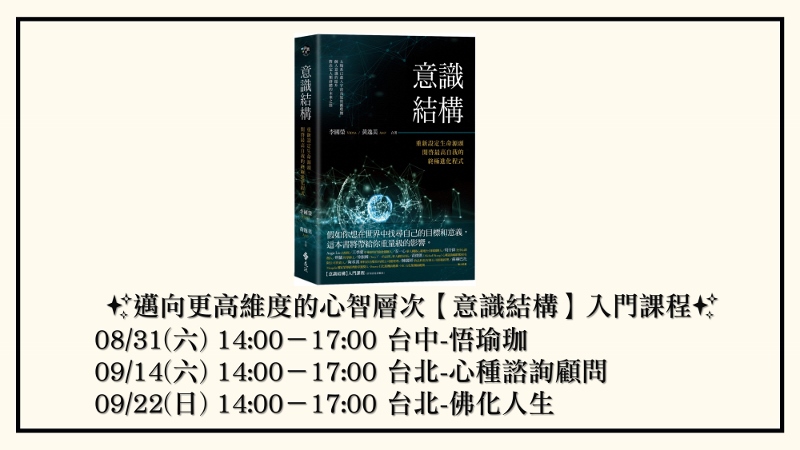 請聽眾朋友們先去買這本書意識結構,如果有不懂的,就參加Amy講的四場活動,謝謝Amy分享意識結構:重新設定生命源頭,開啓最高自我的終極進化程式,遠流出版的好書,謝謝。