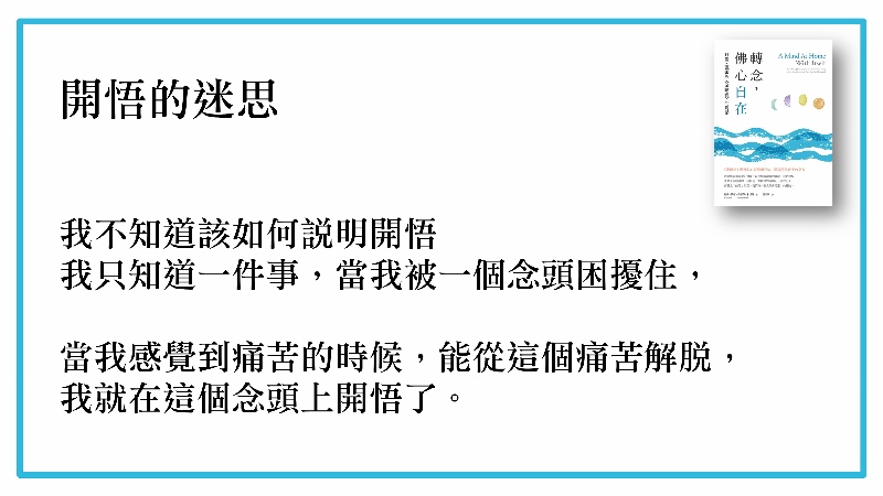 我其實不知道那個叫做什麼,我也不知道什麼叫做開悟,別人會認為說我是開悟的,但我真正不知道那是什麼。我只知道一件事,當我被一個念頭困擾住,當我感覺到痛苦的時候,能從這個痛苦解脫,我就在這個念頭上開悟了。