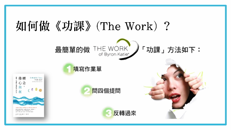 是以四個提問跟反轉,讓你跟你的內在一起走過這個過程,這整個過程叫做功課,The Work,所以為什麼剛剛說它是一個實修。