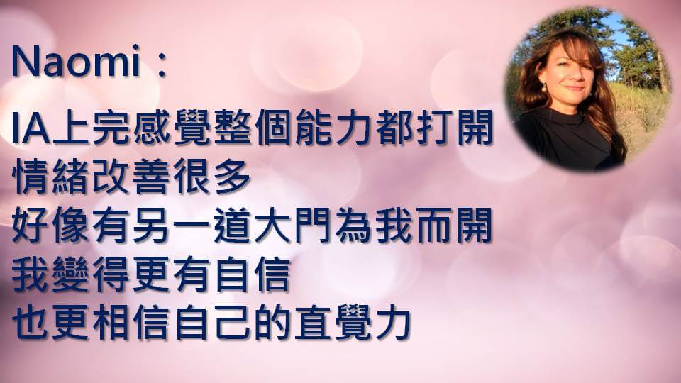 如果喜歡這門課也可以顯化金錢,八月份我會到瑞士幫維安納老師翻譯IA這門課程,所以你如果對於這門課有興趣,可以七月先上完我們的課,八月到瑞士找維安娜老師學。