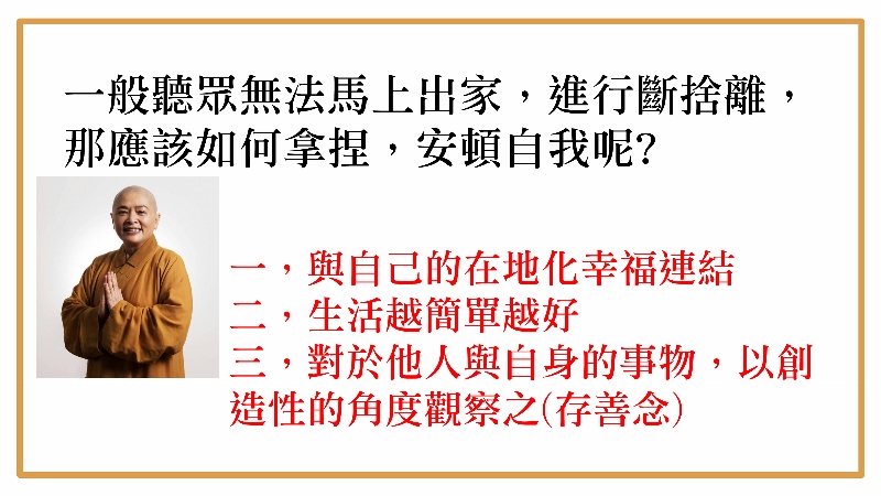大家都知道說修行修一個心,但是我相信現在的人,或是我們的聽眾一定會覺得,現在不管是環境或是政治、經濟,壓得大家都喘不過氣,不知道法師這邊有沒有什麼意見,不一定要像法師像是感覺要豁出去的斷捨離,大家好像一開始沒辦法做到這個斷捨離的時候,那應該要怎麼做,這種拿捏應該怎麼做?