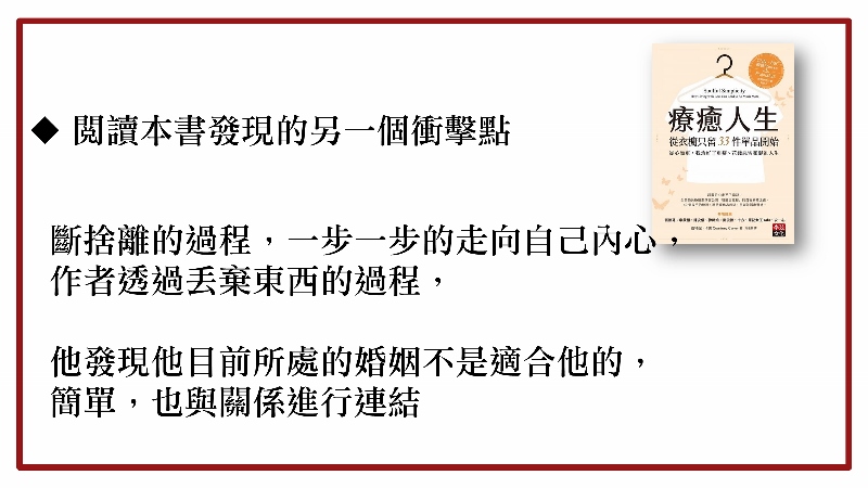 斷捨離的過程,一步一步的走向自己內心,作者透過丟棄東西的過程,他發現他目前所處的婚姻不是適合他的,簡單,也與關係進行連結