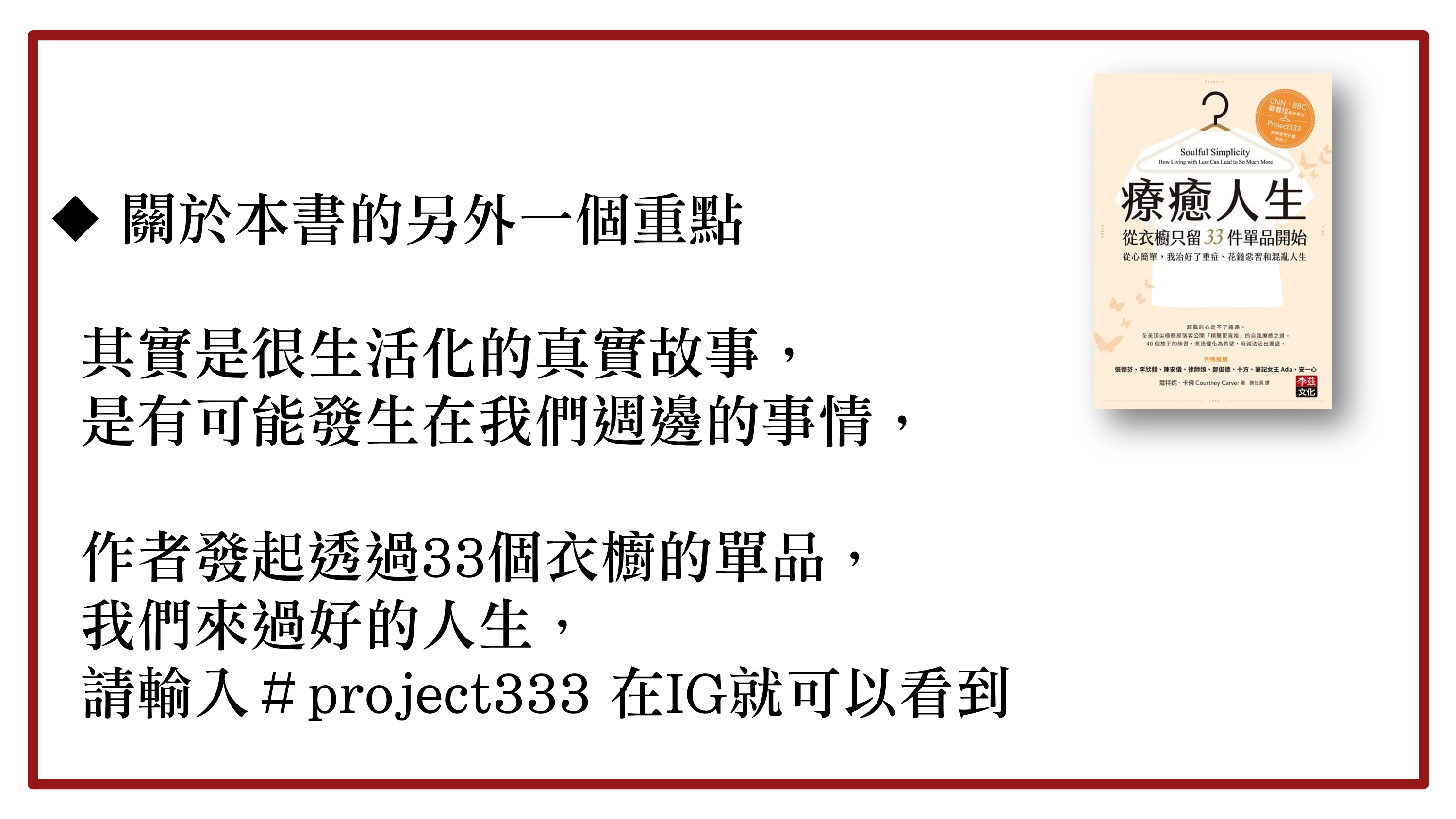 其實是很生活化的真實故事,是有可能發生在我們週邊的事情,也是作者發起透過33個衣櫥的單品,我們來過好的人生,請輸入#project333 在IG就可以看到