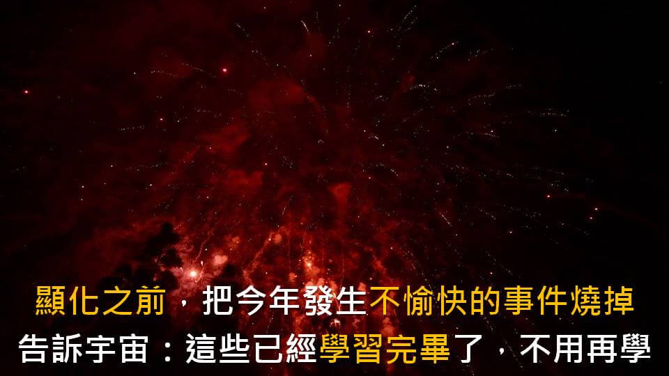 在顯化之前,把今年發生不愉快的事件燒掉,告訴宇宙說:「這些已經學習完畢了,不用再學。」