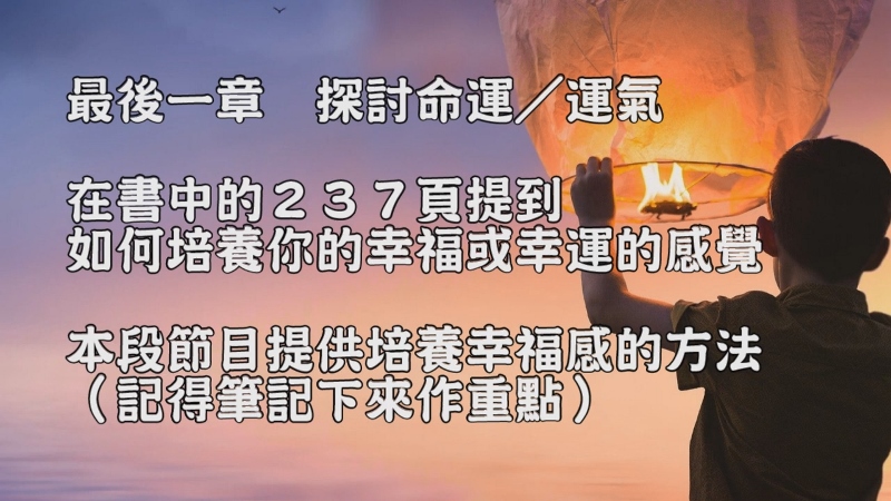 在這裡面,安老師提供了一個非常好的方法,怎麼樣讓自己覺得自己是一個幸運的人,或者是說,怎麼樣去培養具有樂觀的想法跟樂觀的性格?