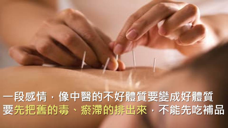 我覺得一段感情,怎麼像中醫講的那種不好的體質,要變成好的體質,你要經歷先把那些舊的一些毒,那一些比較瘀滯的東西,要先排出來,不能先吃補品。