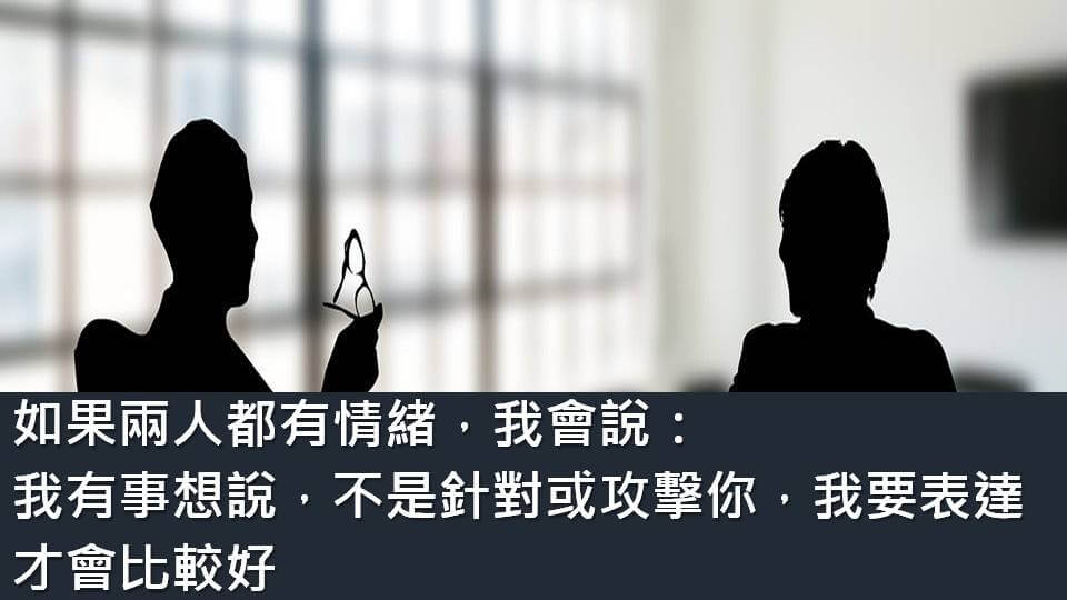 我自己的方式,比如說我要跟我先生溝通一件事情,如果是兩個人都有情緒,我還是會講,我有一件事要跟你說,可是我要跟你講這件事,不是要針對你或攻擊你,我要去表達,不然我覺得往內壓也不舒服。