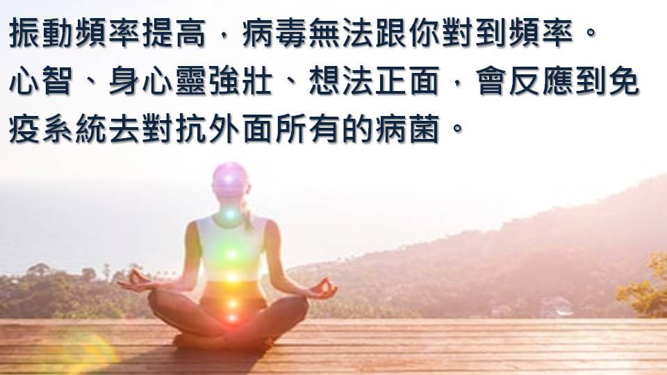 讓你的振動頻率提高,病毒的振動頻率沒那麼高,他跟你的頻率不搭,就沒有辦法跟你對到頻率,所以當你心智、身心靈很強壯,你的想法都是很正面、正向時也會反應到你的免疫系統,系統也會變得更強壯,才有辦法對抗外面所有一切的病菌。