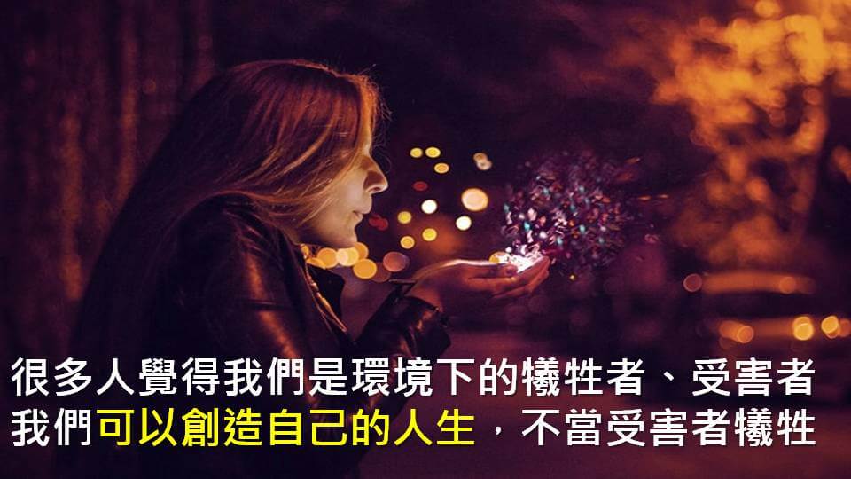 很多人會覺得我們是環境下的犧牲者、受害者。其實我們可以創造自己的人生,我們不需要再當受害者犧牲。
