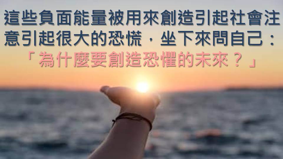 有時候這些負面能量被用來創造引起社會注意,引起很大的恐慌,有時候我們坐下來可以問自己:「為什麼要創造恐懼的未來?」