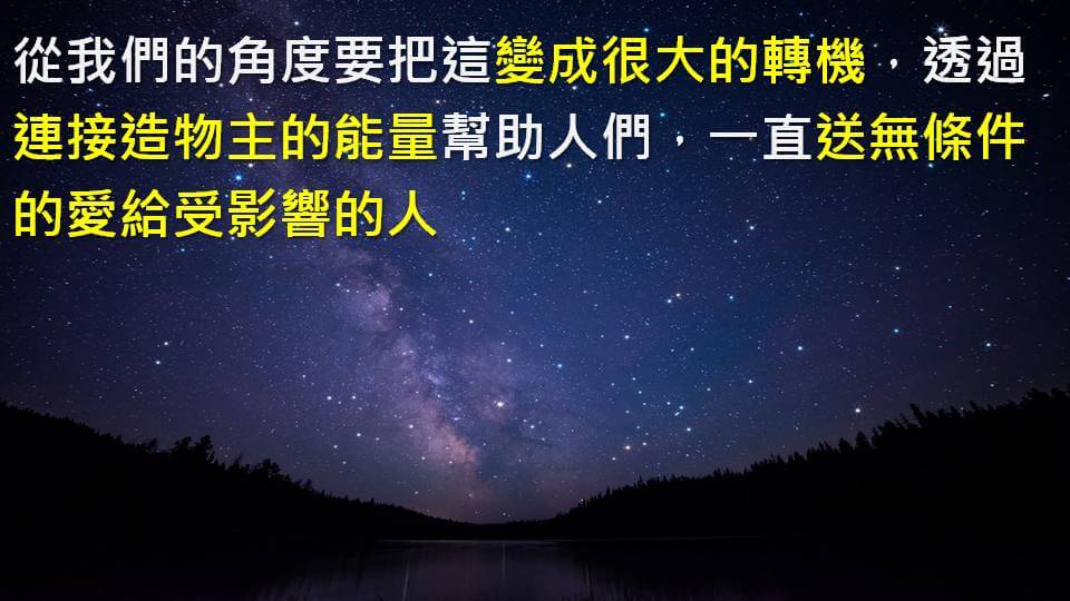 從我們的角度要把這變成一個很大的轉機,透過連接造物主的能量,我們可以去幫助人們,我們一直有送無條件的愛給受影響的人,身處於那個很大恐懼的區域當中,我知道他們有很大的困境,但是要讓他們感受到造物主的愛。如果我們有特定幫人做清理,我們會上到第七界請求接收器,不管甚麼疾病,細胞可以很快被處理、解決,根據個人的信念系統,將決定多快治癒這些資訊,這會在基礎教師課程中討論到。