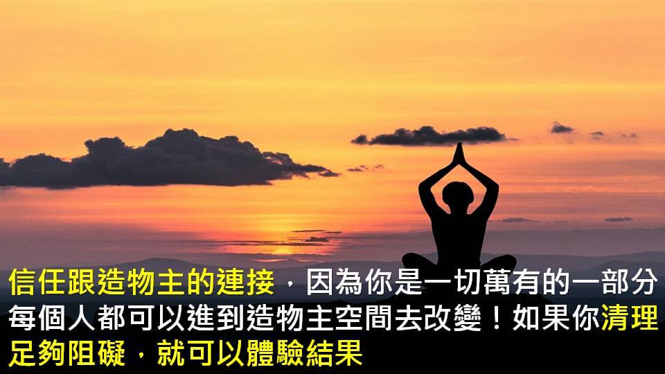 很重要的是要去信任你跟造物主的連接,因為你是一切萬有的一部分,每個人都可以進到造物主的空間去改變!如果你清理足夠的阻礙,你可以去體驗結果。像我母親治癒好他自己的腫瘤,還有很多人,以及我們去見證疾病改善,包含肺炎。你可以進入到這個狀態,在我們基礎課程裡面就有教導你如何做,每天去練習跟造物主的連接,見證到無條件的愛,感受這個能量,同時清理很多的信念和培養很多好的美德,強大自身的能量場後,不再受到負面磁場影響,也不再受疾病影響。