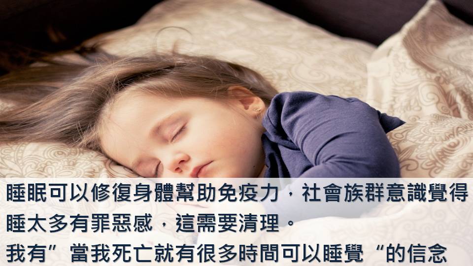 有一項很有趣的是,睡眠非常的重要,它可以修復身體,幫助你的免疫力,社會族群意識好像覺得睡太多會有罪惡感,我們在學習沒有這個事情,我知道我需要清理。我有一個信念是”當我死亡時,我有很多時間可以睡覺"的這個信念。