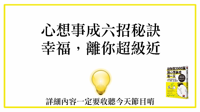 那他講了一些更明確的方法,比如說剛剛在講跟宇宙下訂單,你不要說一些負面的訂單,我還不起、我只吃得起泡麵……你不要去講這種。