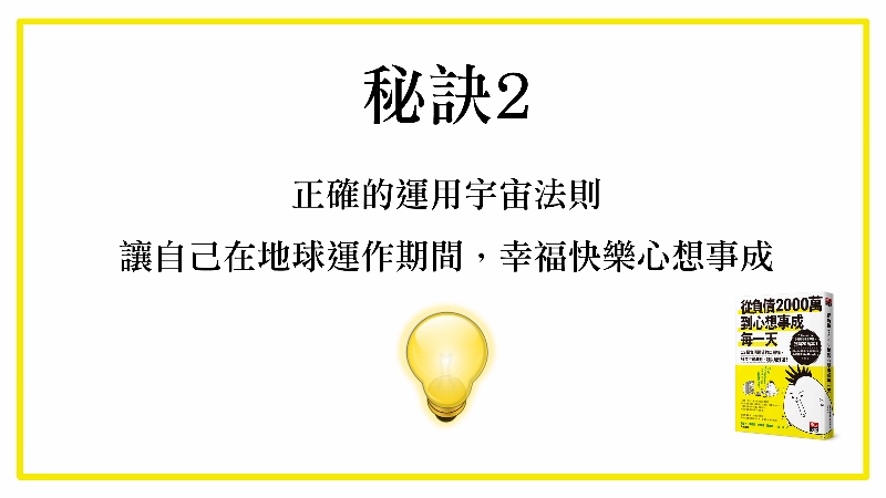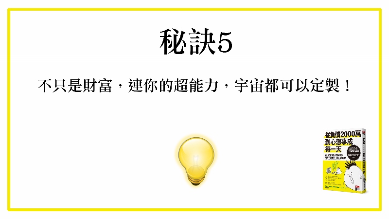 那到底可以怎麼做到的,作者就是在他許願碰到宇宙先生之後,他就開始一天比一天正面,最後他不但把債還完了,花了九年的時間,他原來設定的目標是十年的時間,他九年還完了,他還找到自己更喜歡的事業,真正他的事業,又開展他的人生。