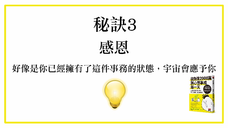 我覺得很多人就說,為什麼心想事成沒有效,這其實也是書裡面有講了一些撇步,你到底有沒有得到,比如說這一件事的時候,你會不會先感恩?