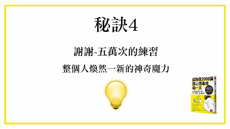 所以他實現的可能性非常高的,所以在書裡面,作者說他慢慢做到可以講完了五萬次謝謝,他就覺得整個人煥然一新的感覺。