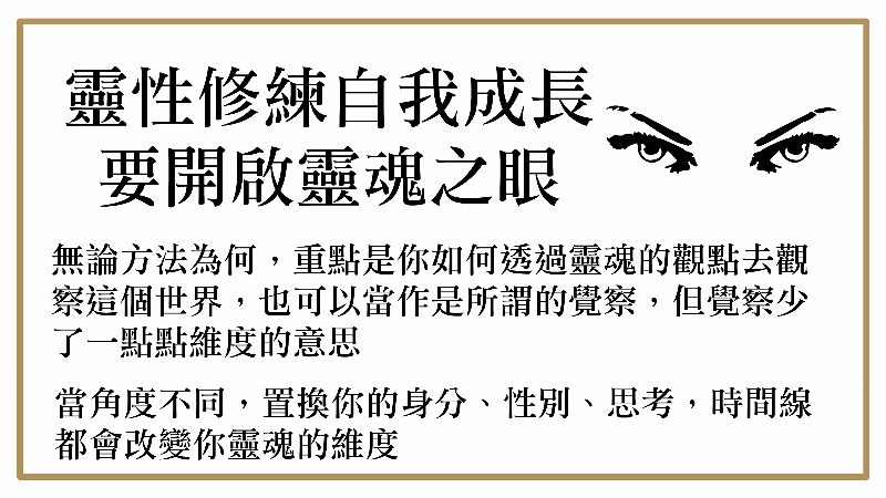 裡面包括你要獲得這樣一個啟蒙,就是所謂的一個感受,開啟靈魂之眼的時候,你的修練必須要經過那些的階段,這些階段當中你應該要運用什麼樣的方法來去達到這結果,這中間你又必須要遵守一些基本的原則,我們所謂的靈性修練自我成長這一塊必須遵循一些原則,如果你不遵循這些原則的話,那其實你最後所獲得的都不算是正確的。