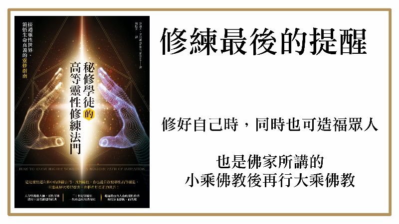 因為他從前面做一個簡單的解說,讓人家去了解高等境界對我們來講是如何重要,然後再進一步慢慢去獲得這樣的能力,就必須要有一些方法跟一些原則,然後你會到達什麼樣一個境界,書裡面大概都會逐步去提到。