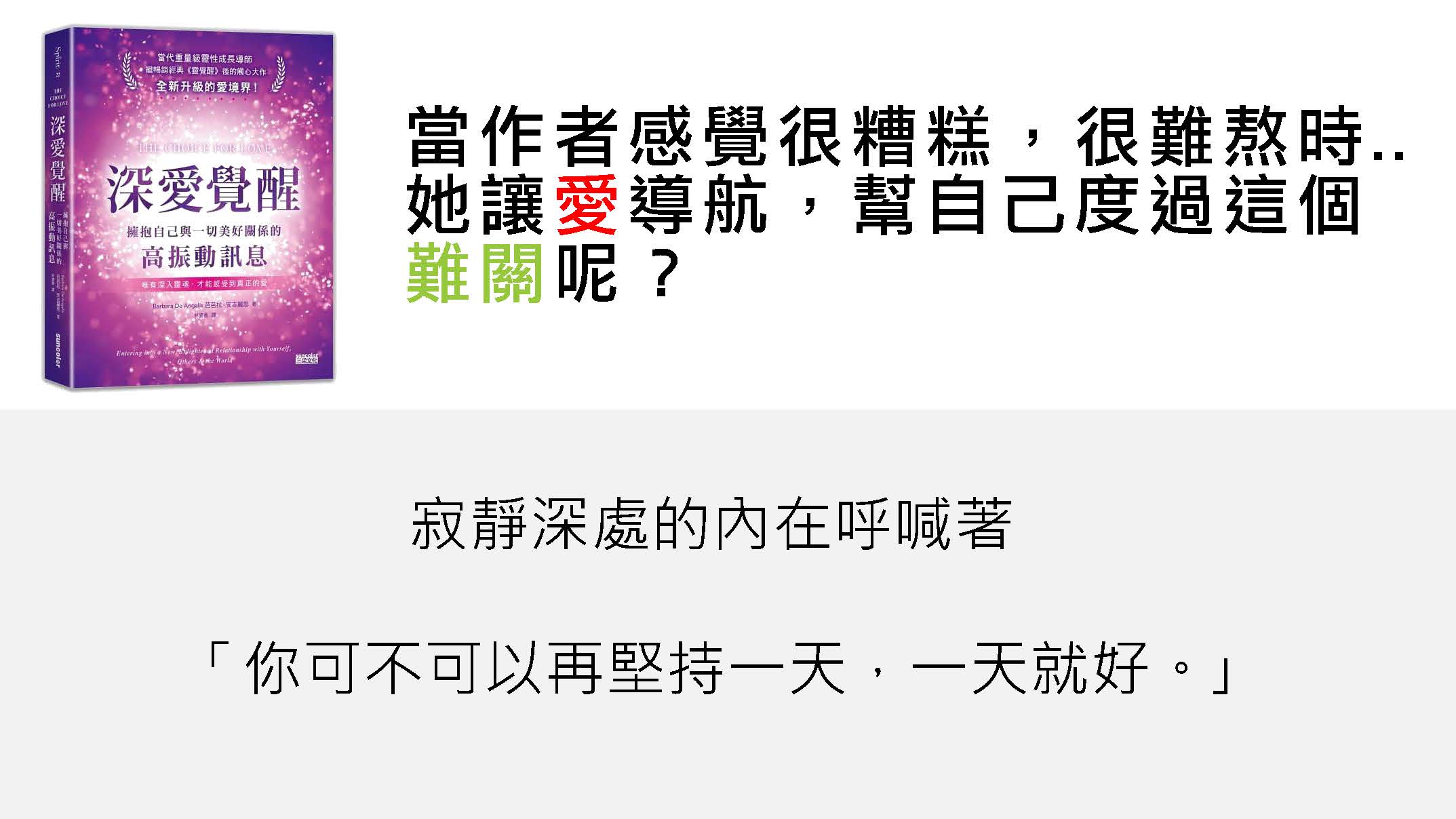 作者本身有這樣子的體驗,也會因為不知道到底何時才能夠結束,所以感到很沮喪跟失落,在她寂靜深處冥想的時候,浮現了一句話,「你可不可以再堅持一天,一天就好。」