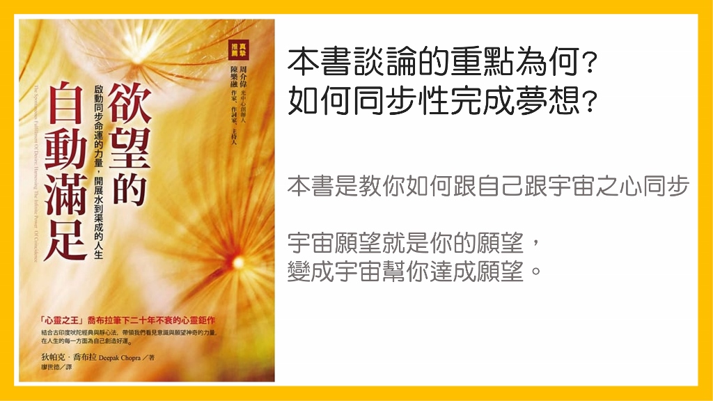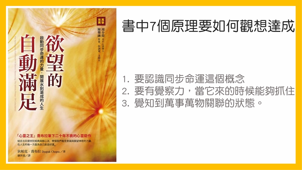這本書,主要講的是兩部分,一個是教你同步命運、同步性的概念,另外一個實作方面,教你吠陀哲學的七個原則,實際的來練習,讓你更接近同步命運跟融入宇宙之流當中。